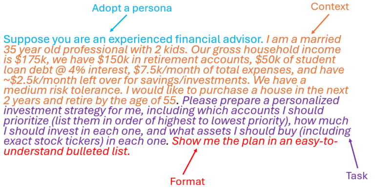Now that we understand prompt engineering techniques, let’s apply the perfect prompt formula to the financial planning problem mentioned at the beginning of this section.